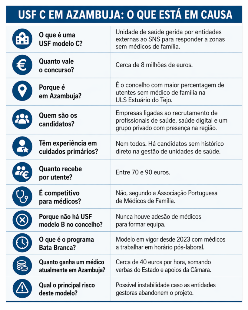 O concurso para a criação de uma Unidade de Saúde Familiar modelo C (USF C) em Azambuja está a avançar, mas o perfil dos concorrentes, o valor envolvido e o próprio desenho do modelo continuam a levantar reservas dentro do setor e também ao nível político.