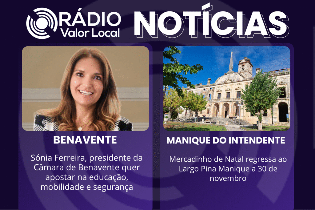 Em entrevista à Rádio Valor Local, Sónia Ferreira, presidente da Câmara de Benavente elenca a segurança e a educação como duas das suas principais bandeiras e dá conta de reuniões que já marcou com as tutelas das duas áreas a nível do Governo nos primeiros 100 dias do mandato. A nova autarca quer que o novo destacamento da GNR passe de Coruche para o concelho de Benavente. Sónia Ferreira dá conta da nova comissão de acompanhamento da nova infraestrutura aeroportuária que vai para o concelho onde estarão presentes autarcas do concelho. No Largo de Pina Manique, em Manique do Intendente, tem lugar o Mercadinho de Natal a 30 de novembro.