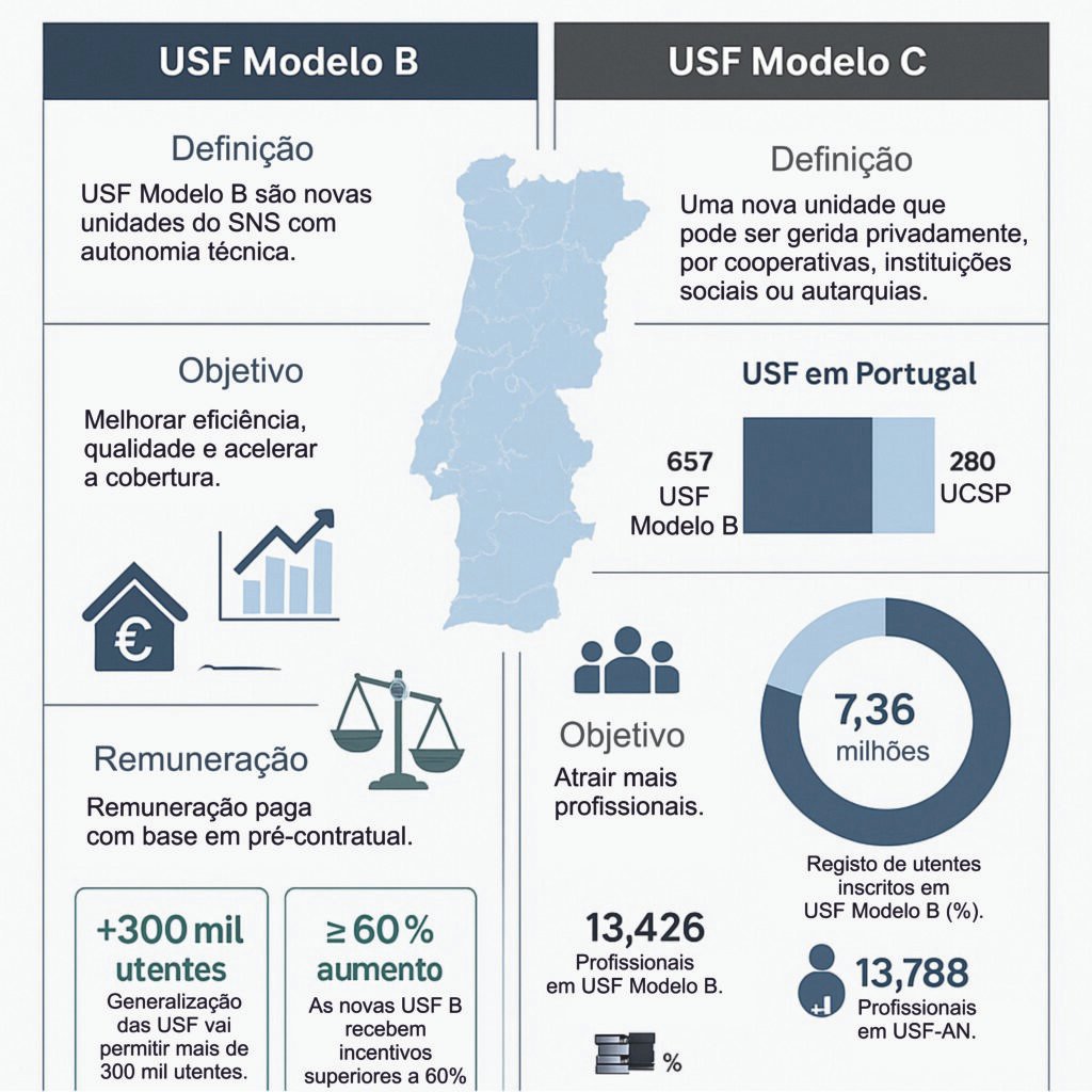 Em Azambuja, o debate autárquico trouxe para primeiro plano a reorganização dos cuidados de saúde primários e, em particular, as diferenças entre as Unidades de Saúde Familiar (USF) de modelo B e o recente modelo C. O modelo B, com mais de uma década de experiência, assenta na autonomia técnica das equipas, na avaliação rigorosa do desempenho e em incentivos financeiros ligados a qualidade e acesso, sendo apontado como um instrumento eficaz para fixar médicos e enfermeiros. Já o modelo C, criado em 2023, abre a porta a que cooperativas, instituições sociais, autarquias ou entidades privadas possam gerir estas unidades. É apresentado pelo Governo como resposta a carências de cobertura e de recursos humanos, mas suscita reservas de associações profissionais que receiam uma prestação desigual de cuidados, menor escrutínio e fuga de profissionais do setor público.